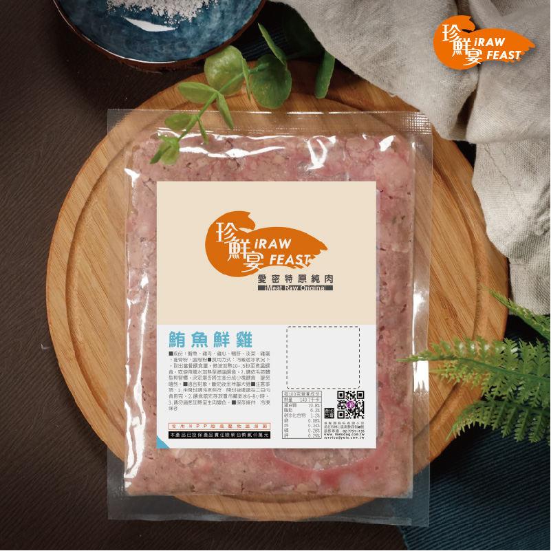 愛密特--原純肉iMeat Raw Original 鮪魚鮮雞 RAW FEAST-珍鮮宴生肉主食餐堅持不使用廉價次等4D肉品,嚴格精選人食級新鮮肉品原料製成,並採用HPP超高壓低溫滅菌技術,完整保留食材的營養素並消除餵食生肉感染致病菌的風險。