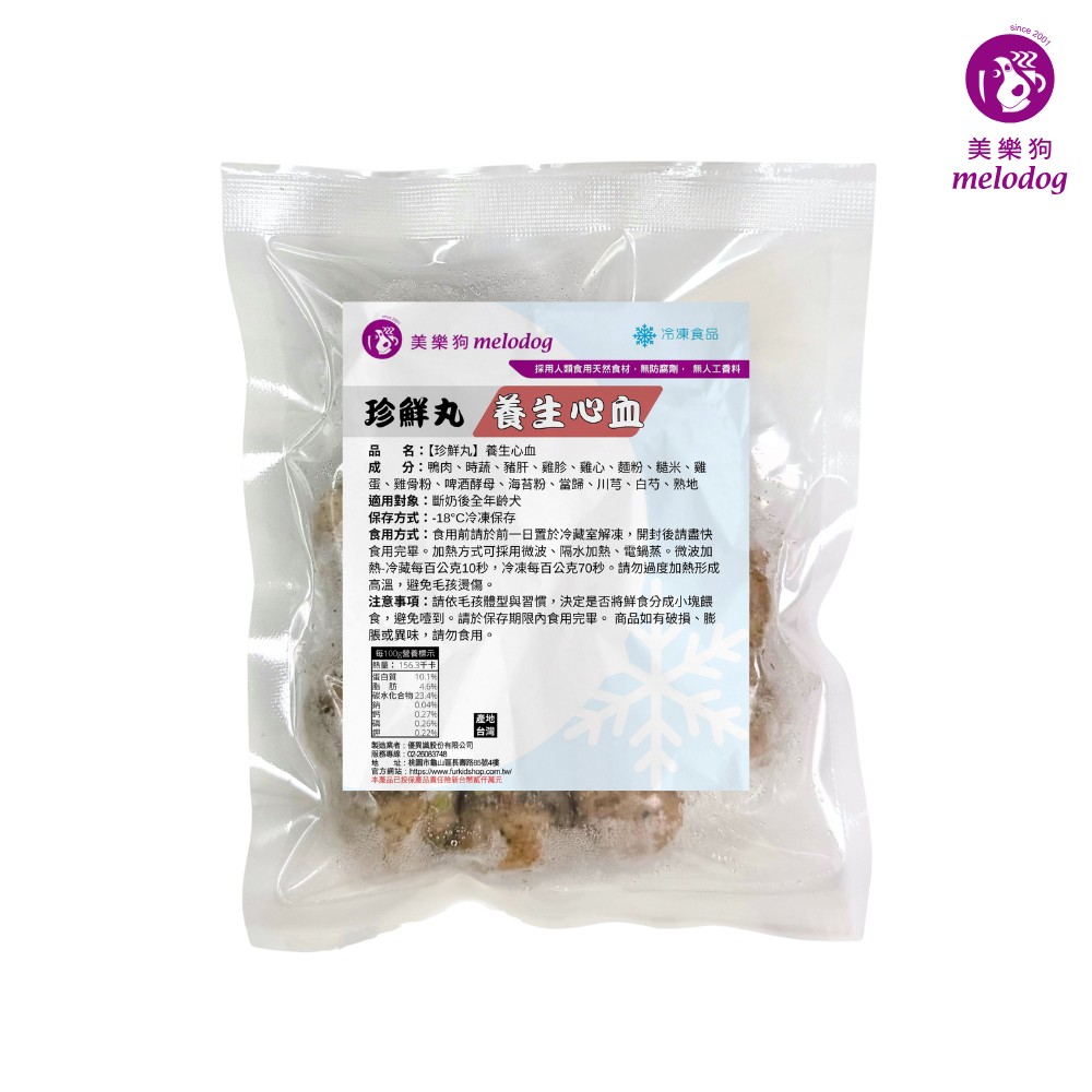 珍鮮丸系列(含穀鮮食) 養生心血丸 美樂狗珍鮮丸可讓狗狗享有鮮食的營養,又很方便餵食,可免去妙鮮包湯湯水水加熱不便或是長毛狗容易湯汁沾到嘴邊毛的情況,而且蔬菜、肉⋯等食材原料都已經絞碎,消化性極佳。此外,由於珍鮮丸種類多,狗爸媽可以根據狗兒的需要,自行DIY調配組合成狗寶貝專屬的鮮食配方。