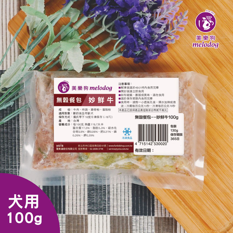 無穀鮮食餐包--妙鮮餐系列 妙鮮牛 主要肉類採用紐西蘭、澳洲進口牛肉,皆為人類食用等級用肉。 時蔬:採用8-12種當季蔬菜及塊莖類。
